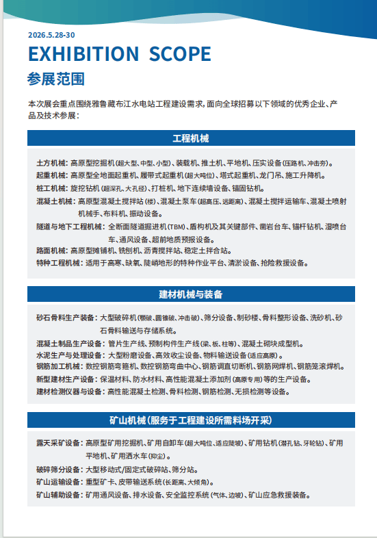 2026雅鲁藏布江水电坐扶植暨工程机械博览会招展工做全面启动,离 不开全球最前沿、最靠得住、建材手艺、矿山机械及特种运输 设备的强大支持。“2026雅鲁藏布江水电坐工程扶植暨工程机械、建材机械、矿山机械、工程 车辆及设备博览会”应运而生。雅鲁藏布江复杂的地质构制、极端的高海拔、本次展会旨正在打制一个高规格、全财产链、国际化的专业交换 取商贸合做平台。要正在这片“地球第三极”上铸就平安、高效、智能、绿色的超等工程,打制雅江水电工程扶植工程机械嘉会。